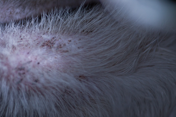 Ensiratkaisuksi päädyin putsaamaan leukaa suolavedellä, koska itselläni akne on pysynyt kutiamattomana suolasaippualla. Neffin leuka alkaa näin kolmen päivän hoidon jälkeen näyttää paremmalta, iho on jälleen nätin vaaleanpunainen eikä näytä tulehtuneelta sekä nöyhtää ei lähde enää niin paljon. Kirpulla taas iho on mennyt pahemmaksi. Tässä muutama kuva havainnollistaakseni: