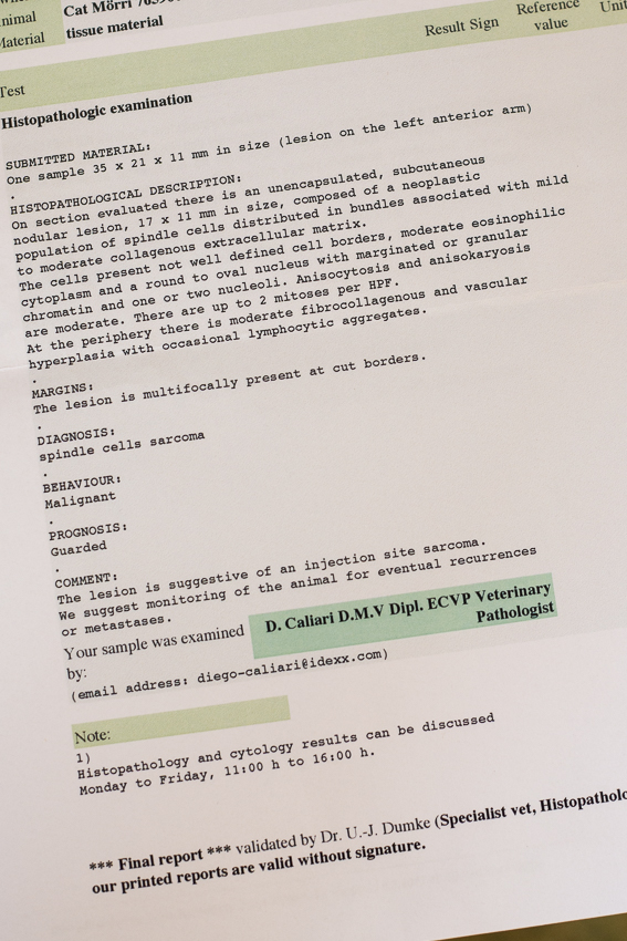 Valitettavasti tulokset eivät olleet niin onnellisia kuin olin vähän salaa toivonut. Kyseessä oli pyörösolusarkooma eli spindle cell sarcoma, ja haavan sijainnista johtuen leikkauksessa ei saatu täysin puhtaita marginaaleja (eivät saaneet tarpeeksi tervettä kudosta kasvaimen ympäriltä poistettua), joten pelko on, että kasvain saattaa levitä. Vaihtoehdot ovat nyt vähän vähissä: oikeastaan odotellaan nyt toipumista. Lääkäri myös väläytti mahdollisuutta koko jalan amputaatiosta. Jos kasvain on jo kuitenkin päässyt leviämään, amputaatio on täysin turha toimenpide.